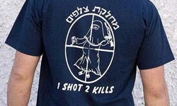 در این تصویر جوان اسراییلی نشان داده می شود که روی پیراهنش عکس یک زن باردار فلسطینی چاپ شده که زیر آن به دو زبان عبری و انگلیسی نوشته شده که یک شلیک، دو کشته! هر از چندگاهی در سرزمینهای اشغالی بروز اتفاقاتی سبب روشن شدن بیشتر ماهیت رژیم صهیونیستی برای افکار عمومی می شود. کشتار زنان و کودکان به بهانههای مختلف، له کردن دختر آمریکایی معترض به خراب کردن خانه فلسطینیها با بلدوزر، اظهارات خاخامهای صهیونیست، اعترافات رسانهای یا مورد اخیر آن یعنی حم