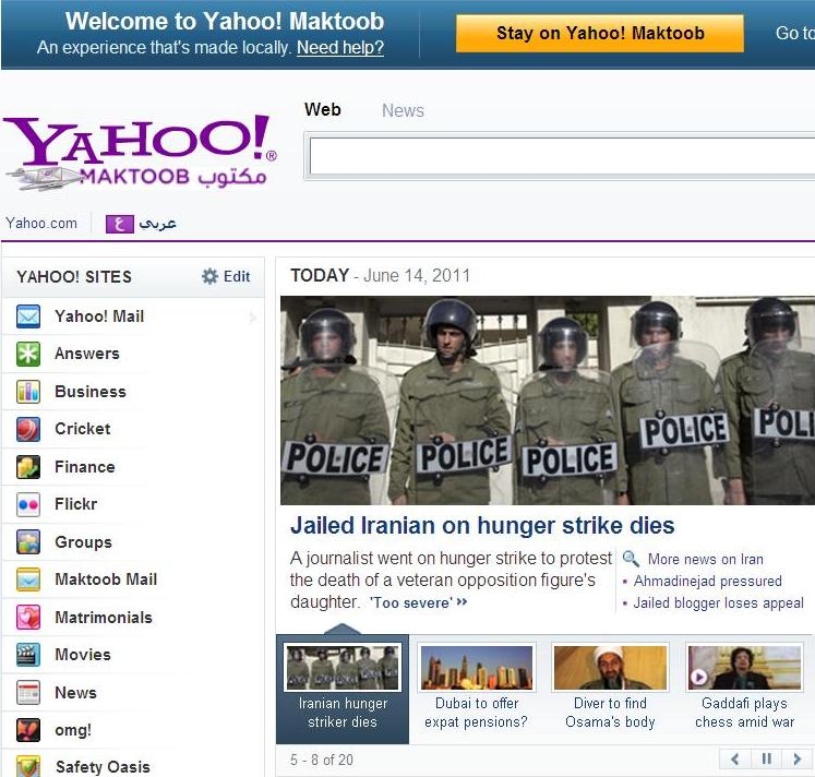 برای کسانی که با آی پی کشورهای خاورمیانه به سایت موتور جستجوی "یاهو" متصل می شوند، به صورت خودکار صفحه ای به نام "یاهو مکتوب" باز می شود که ظاهر عربی دارد. هنگامی که این روزها صفحه "یاهو مکتوب" را باز می کنیم به اخباری از ایران برمی خوریم که به طور یک طرفه به پوشش اخبار مربوط به مرگ هدی صابر می پردازند و یا تصویر سربازان نیروی انتظامی را که برای ایجاد امنیت در روز 22خردادماه در صحنه حاضر شده اند به نمایش می گذارند. این در شرایطی است که مصادف با همین روزها در کشورهای عربی که نام این صفحه نیز یاهو مکتوب عربی است؛ اتفاقات مهم تر و جالب تری درحال وقوع است که شاید کشورهای غربی و یا دوستان عربی شان حاضر به دیدن آن نیستند. در خبرهای این صفحه خبری از انقلاب های بحرین و یمن و اردن و...نیست و البته جای خالی آن ها را شاید با سوریه بتوان پر کرد!