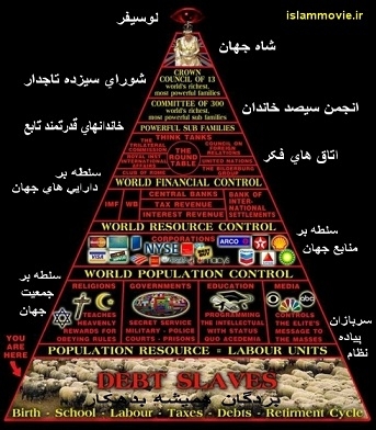 خداوند در سوره توبه می فرماید : "یُرِیدُونَ أَنْ یُطْفِئُوا نُورَ اللَّهِ بِأَفْوَاهِهِمْ وَیَأْبَى اللَّهُ إِلَّا أَنْ یُتِمَّ نُورَهُ وَلَوْ کَرِهَ الْکَافِرُونَ"اما تفسیر پله به پله هرم راس هرم در کمال بی شرمی چشم شیطان را در راس این هرم قرار داده اند و همان گونه که می دانید (با این که ما توقیت نمی کنیم) این چشم به شدت به چشم دجال آخرالزمان شباهت دارد . شاه جهان تصویر یک شاه در بالای هرم قرار دارد. یعنی یک نفر پادشاه کل جهان است بی آنکه شما بدانید. البته پژوهش گران غربی بیان کرده اند که احتمالا این شاه جهان همان ملکه انگلیس (ملکه الیزابت) است.شاید به همین دلیل کشور انگلیس سلطنتی نگه داشته شده است.برای اطلاع شما مسئولان شبکه های BBC را ملکه الیزابت به شخصه تعیین می کند. در فیلم ۲۰۱۲ که پایان دنیا را به تصویر کشیده است اولین کسی که وارد کشتی نجات بخش می شود ملکه انگلیس همراه ۲ سگ خود است. (در فیلم ۲۰۱۲ کشتی نجات بخش با کشتی نجات بخش حضرت نوح (ع) مقایسه می شود. کشتی نوح دینداران را نجات داد ولی کشتی آمریکایی ها ثروتمندان را نجات می دهد.) شورای ۱۳ تاج دار در این طبقه ۱۳ خانواده سلطنتی کل دنیا را اداره می کنند. از جمله این خاندان ، خاندان سلطنتی بریتانیا ، خاندان سلطنتی اسپانیا ، خاندان سلطنتی مالت (که در جزیره مالت ساکن اند) و غیره می باشند. انجمن ۳۰۰ خاندان در این طبقه ۳۰۰ خاندان ثروتمند یهودی معرفی می شوند که زیر نظر ۱۳ خاندان تاجدار دنیا را اداره می کنند.این ۳۰۰ خاندان به قدری ثروتمنداند که ثروتشان در مخیله من و شما نمی گنجد. طبیعتا منظور از خاندان ثروتمند خاندانی چون Bill Gates نیست. این ۳۰۰ خاندان یهودیان هستند که نامشان کمتر به گوشمان خورده یا اصلا به گوشمان نخورده است. خاندان روچیلد ، خاندان راک فِلِر ، خاندان مِندِز ، خاندان آبنادانا ، خاندان بِنونیزد از آن دسته اند. نکته : گفته شده است که دجال خود را امام زمان معرفی خواهد کرد. یاران امام زمان ۳۱۳ نفراند. ۱۳ تاجدار + ۳۰۰ خاندان = ۳۱۳ خاندان های قدرتمند تابع این خاندان تعدادشان می تواند متغیر باشد. باز ویژگی اینها ثروتمندی و اغلب یهودی بودن است. شاید خاندان Bill Gates در این طبقه بتواند قرار گیرد. اتاقهای فکر اکنون که این خاندان ثروتمند جمع شده اند تا بر دنیا حکومت کنند طبیعتا ثروتمندی آنها دلیل بر متفکر بودنشان نیست. پس باید اتاقهای فکری ترتیب داد و از بزرگترین متفکران دنیا در آنها استفاده کرد تا بتوانند هرچه بهتر در راستای اهداف صهیونیسم در ضمینه های سیاسی ، اقتصادی ، فرهنگی ، هنری ، ورزشی و ... به اداره دنیا بپردازند. کل تشکیلات و لژهای فراماسونری که اینهمه در مورد آن بحث شد در این طبقه قرار می گیرد. از اعضای این گروه که در تصویر به آنها اشاره شده میتوان به گروه بیلدربرگ ، کلوپ رم و ... اشاره کرد. سلطه بر دارایی های جهان تمام بانک های جهانی بلا استثنا توسط یهود اداره میشود. یعنی اگر پول خود را در بانکهای جهانی قرار دهیم یعنی در اختیار یهود قرار داده ایم تا با آن به تجارت بپردازد. Pay Pal ها از این دسته اند. بنیان گذار ربای شبکه ای همین یهودیان هستند. در تاریخ درج شده که گاهی اوقات در اروپا تا ۴۳ درصد از مردم ربا می گرفتند. خون مردم را در شیشه کرده بودند. سلطه بر منابع جهان یهود قصد دارد بر تمام منابع جهان تسلط بیابد به همین دلیل به برخی کشور ها حمله می کند تا به هر قیمتی بر آنها مسلط شود. به آمار زیر توجه کنید ... تخمین ذخایر نفت برخی کشور های جهان: آمریکا و نروژ ۱۰ سال کانادا ۸ سال ایران ۵۳ سال عربستان ۵۵ سال امارات ۷۵ سال کویت ۱۱۶ سال عراق ۵۲۶ سال به همین دلیل هر کجا که منبع غنی باشد یهود آنجاست. برای همین یهود از کل اروپا لهستان را انتخاب می کند. چون لهستان منابع غنی پتاس داشت و انبار غله اروپا بود. همان طور که می دانید پتاس ماده اولیه تولید مواد منفجره چون باروت است. یهودیان در اروپا جنگ راه می انداختند و به کشورهای اروپایی باروت و غذا می فروخت و با جنگ راه انداخ